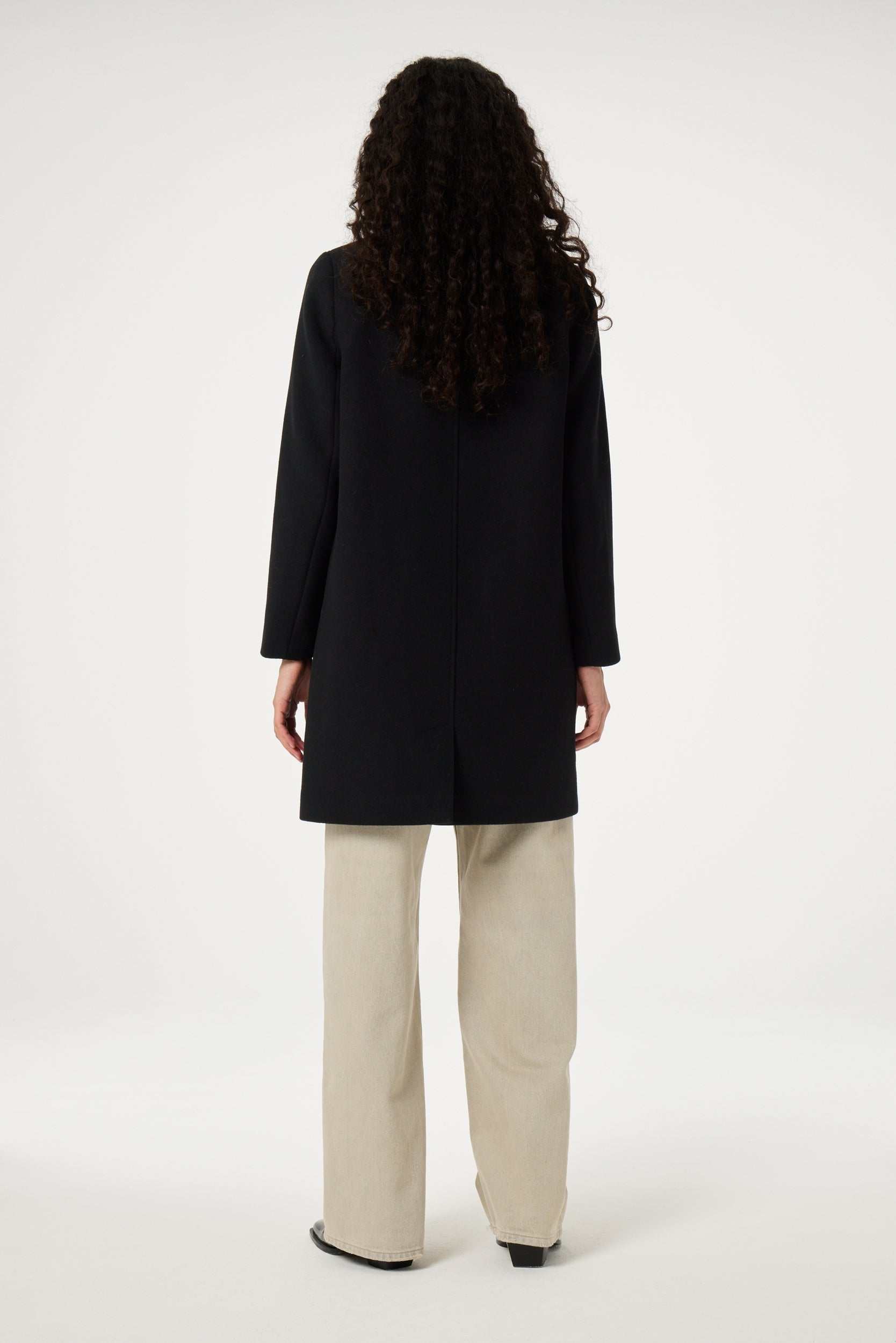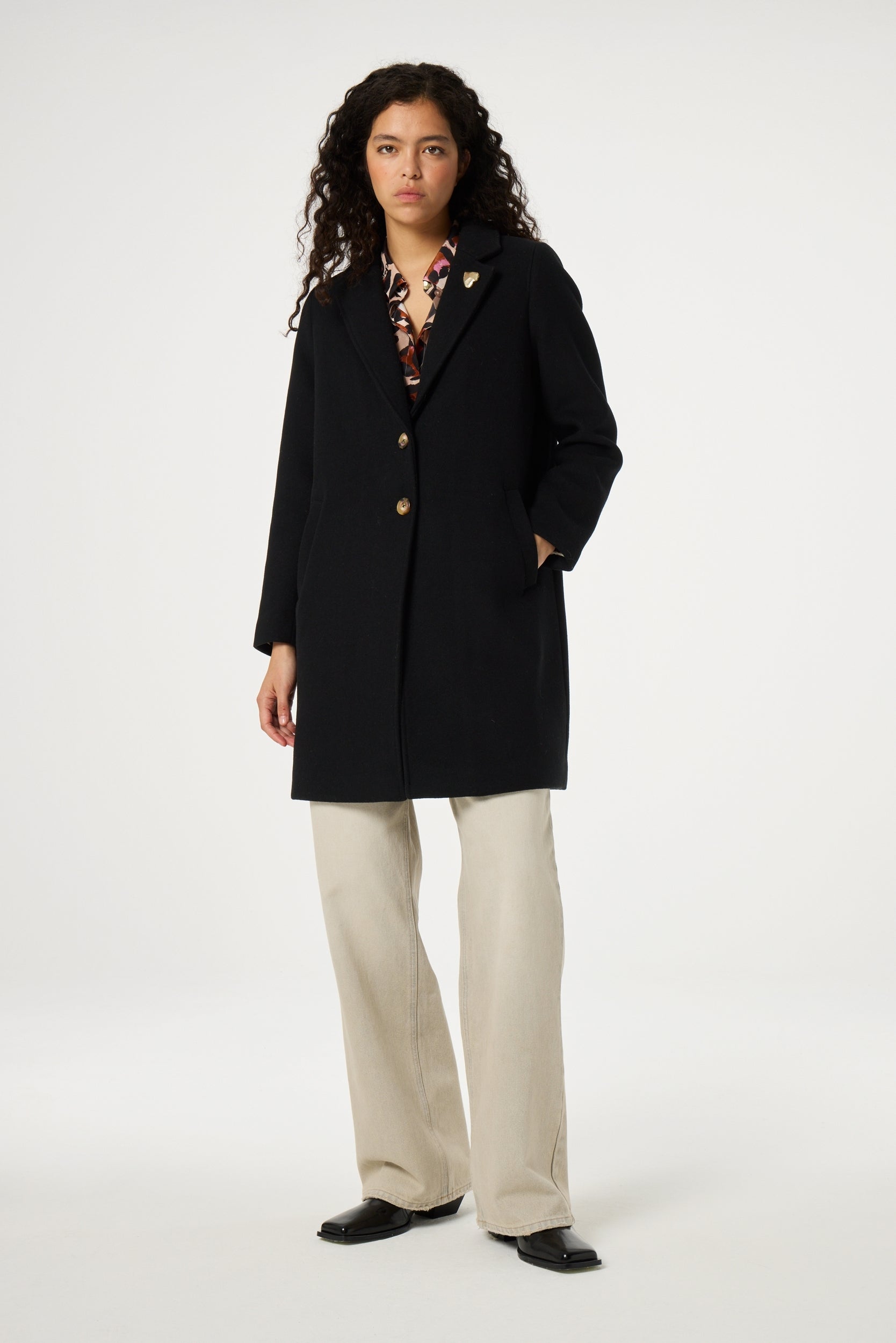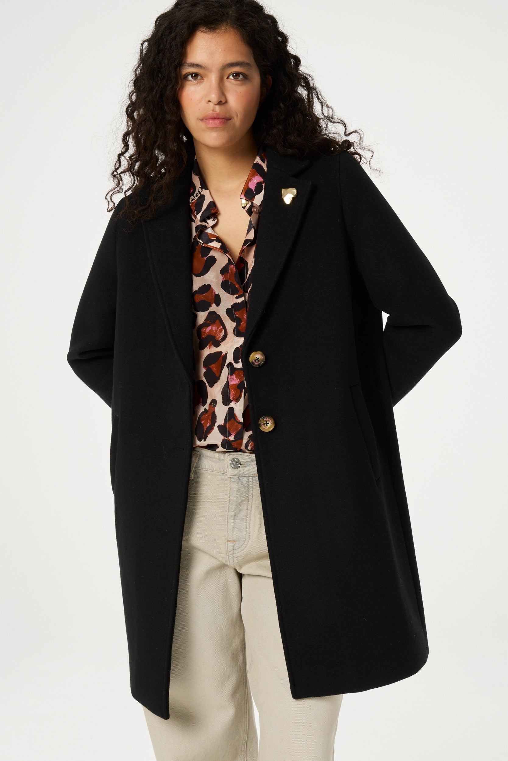 Deze zwarte mantel heeft een klassieke uitstraling en is gemaakt van een blend van polyester en wol. De jas sluit met 2 knopen aan de voorkant, heeft 2 steekzakken aan de zijkant en heeft een gouden hartspeld op de kraag.